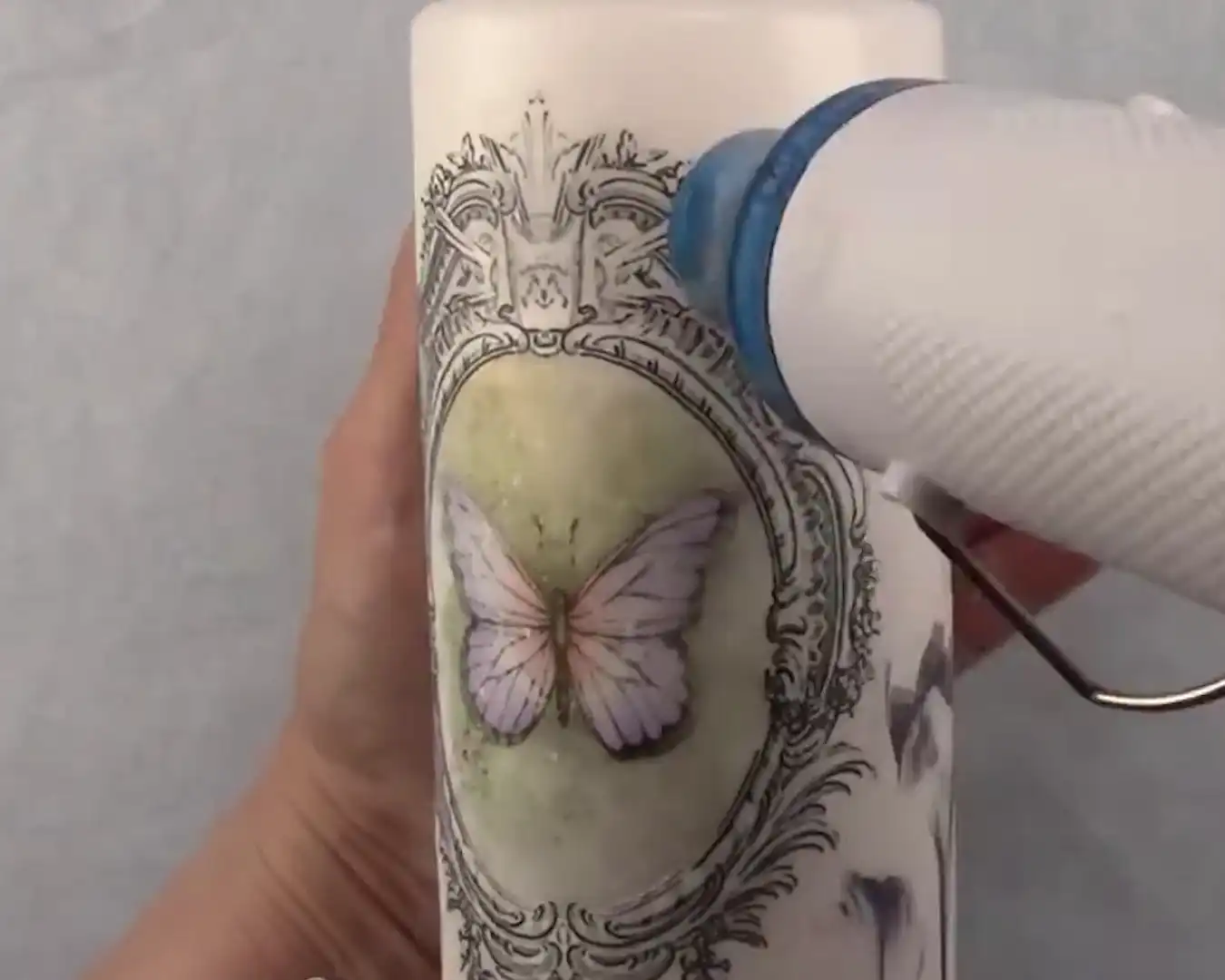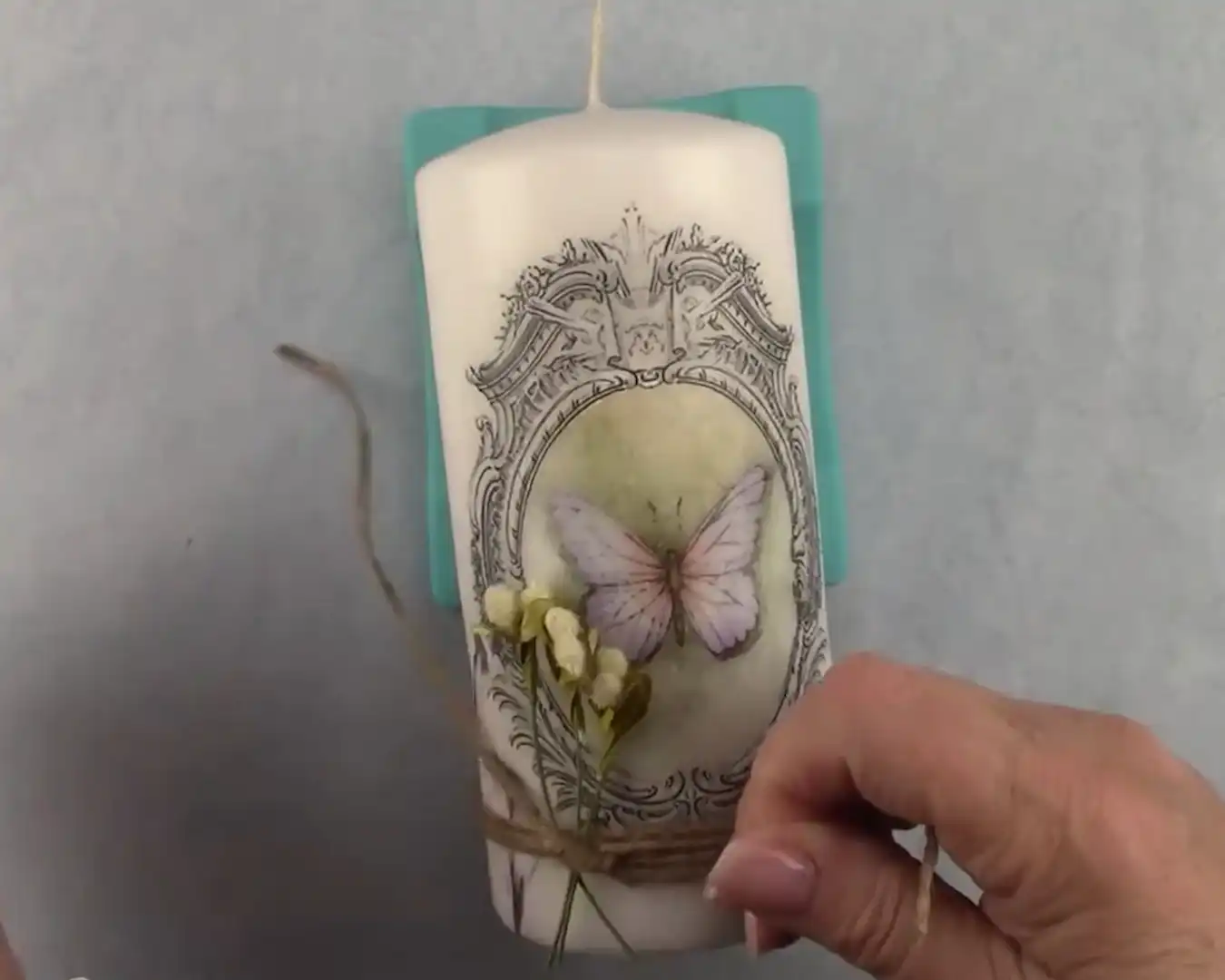 Ga met een hittepistool vluchtig over de kaars heen. Dit zorgt voor een goede versmelting van de was, de lijm en de afbeelding.